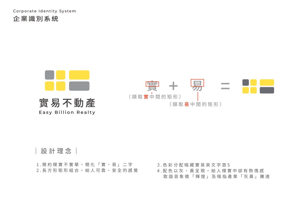 設計理念|簡約樸實不奢華,簡化「實、易」二字,長方形舉行組合,給人可靠、安全的感覺,色彩分配暗藏實易英文字首S,配色以輝、黃呈現,給人樸實中卻有熱情感,取諧音象徵「輝煌」及暗指產業「灰黃」騰達。